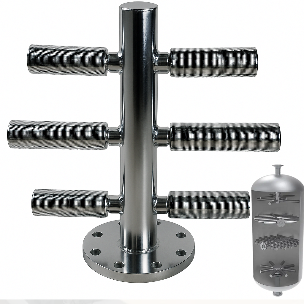 • Header / Hub — horizontal or radial configurations • Connections: Threaded, Flanged, or Welded • Lateral construction: o Screen-Only o Screen-Over-Perforated Pipe (for higher structural load) • Vessel fitment: flat, conical, or dished heads • Uniform spacing for balanced flow distribution • Scalable from small ion-exchange vessels to large industrial towers |